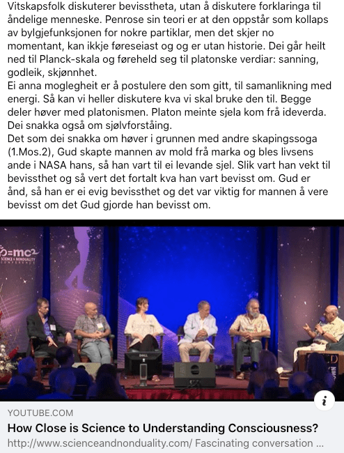 Eg er tydelegvis den typen som mange prestar og kristne leiarar vender tommelen ned for. Og kvifor det? Det kan eg spekulere på, men kanskje aller helst la vere å spekulere så mykje på det, for Jesus sa at verda hata han og derfor skal vi ikkje undre oss over at ho hatar oss også. Først og fremst skal eg ha det klart for meg at eg vart benåda ved at eg bøygde meg ved korsets fot og tok imot den nåden Gud gav meg på grunnlag av at Jesus døde i staden for meg. Eg bøygde meg for Kristus og han gav meg livets vatn av berre nåde, gratis, utan krav om gjerningar. Og det skal eg halde fram med. Når dei då like vel vender tommelen ned for meg, blir det tydeleg at det er fordi eg ikkje er den rette typa for dei, som representantar for den tradisjonelt lærde overklassa. Eg er frå ein utkant på Sunnmøre, eg er kroppsarbeidar, fiskar. Og så har eg studert realfag.