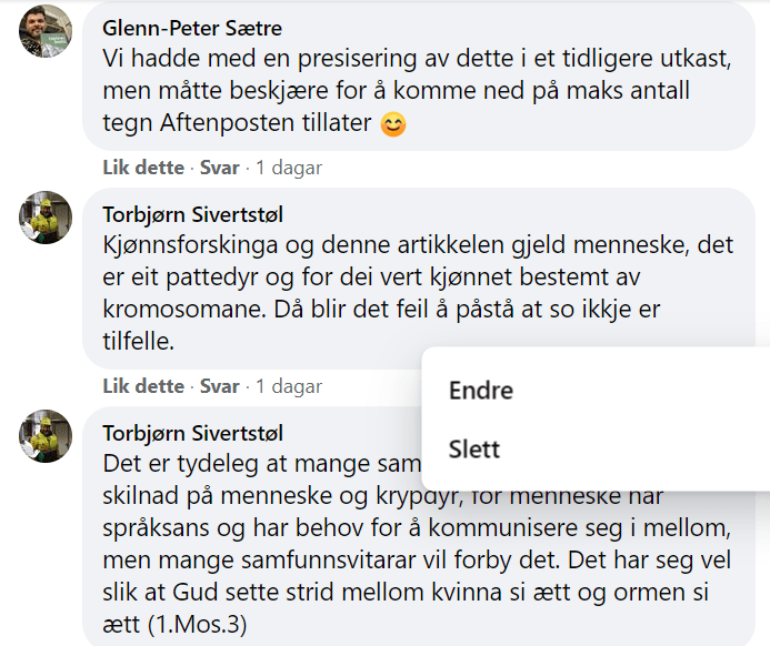 Eg forstår det slik at dette handlar både om biologien og om menneske som ei levande sjel, som levde i samfunn med Gud som er ånd. Det er personleg, så det handlar om ein mann og kona hans. Vi kan forstå det både som partikularia, mannen Adam og kvinna Eva og som universalia, mann (Adam tyder menneske) og kvinne. Eg forstår det slik at Adam representerte menneska overfor Gud, gjerne ved at han var hovdingen for eit folk, at Gud skape Eva av sidebeinet hans, betydde dermed at ho var av hans eige folk.