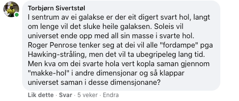 Men i sentrum av dei fleste galakser er der eit stort svart hol og det vil med tida sluke heile galaksa. Så det høver no med det som står skrive her. Dei vert utskifta, vert det sagt. Etter lang tid vil dei svarte hola likevel «fordampe» på grunn av Hawking-stråling. Men det tek ubegripeleg lang tid. Universet er 13,8 milliardar år. Å setje ein null bak betyr ti gangar så lang tid. Men vi må setje omlag 90 nullar til bak, for å få den tida dei svarte hola treng på å «fordampe».