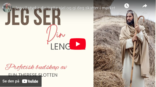 I januar 2024 oppdaga eg at Elin Therese Slotten kom med profetiske bodskapar som ho la ut på youtube og facebook og sidan har ho kome med fleire. Eg har teke imot dei som om dei var til meg og lagra dei her: https://blessings-from-heaven.com Det kan vel vere mange andsre som kan seie det same. … Continue reading Lovnad og profeti 7. Jesus vil styrke di trøtte sjel og gi deg skattar i mørkret.